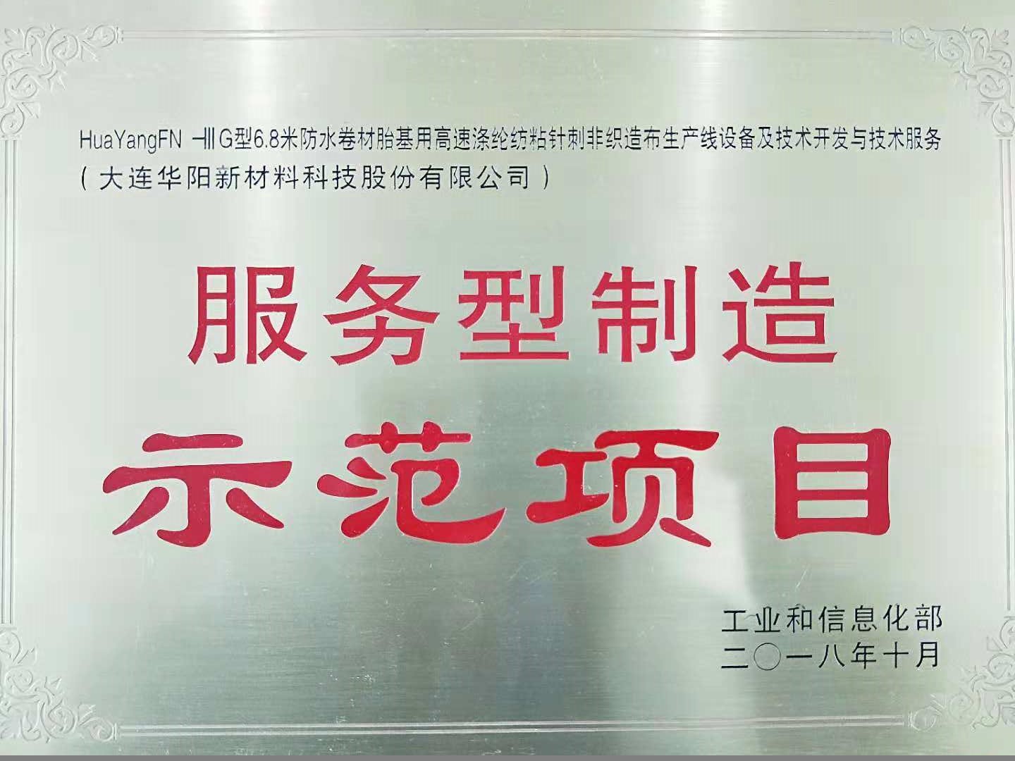 2018年10月,“HuaYangFN-IIIG型6.8米防水卷材胎基用高速涤纶纺粘针刺非织造布生产线设备及技术开发与技术服务”——服务型制造示范项目;