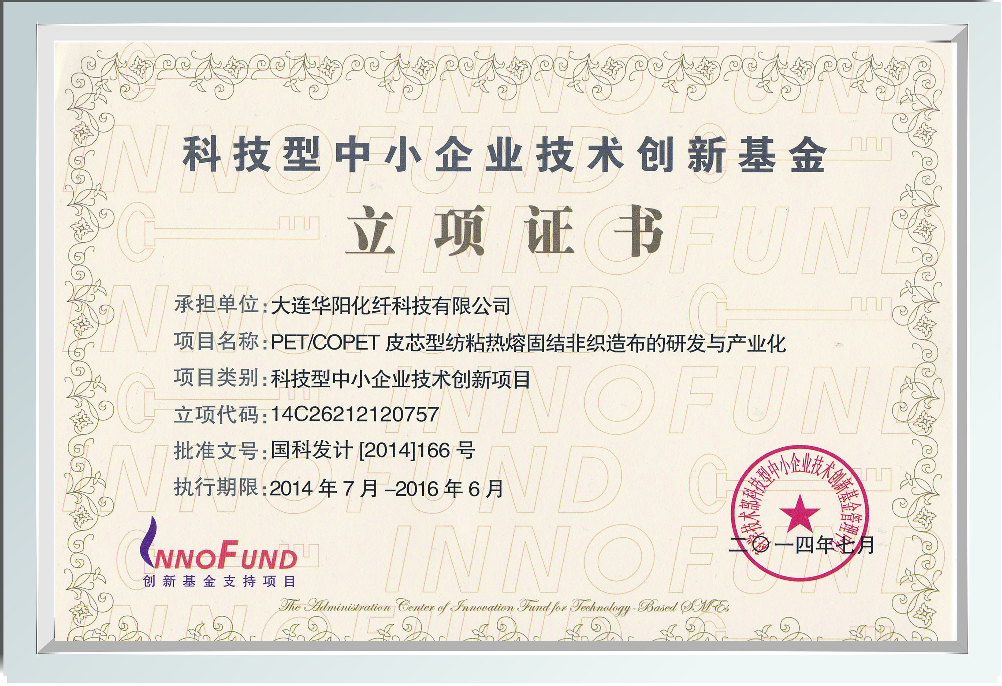 2014年7月,”PET/COPET皮芯型纺粘热熔固结非织造布的研发与产业化“——科技型中小企业技术创新基金立项证书;